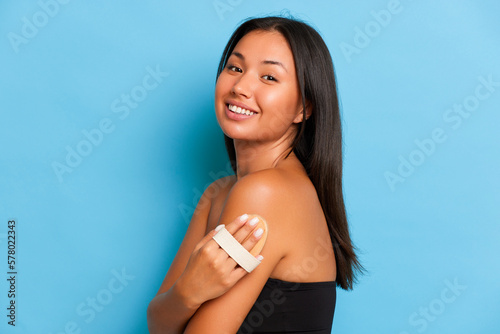 People and body care concept. Happy young Asian woman keeps body brush on the arm side body care routine smiles gladly poses over blue background