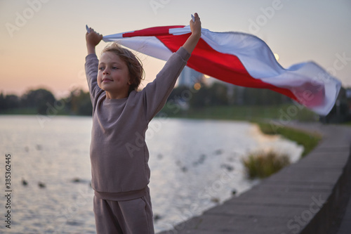 People at a protest in Belarus. Boy with a flag at a protest.