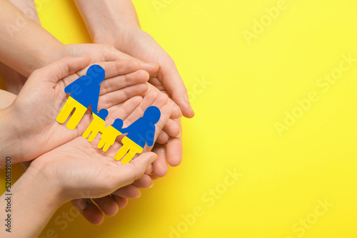 People holding paper family cutout in colors of Ukrainian flag on yellow background, top view. Space for text