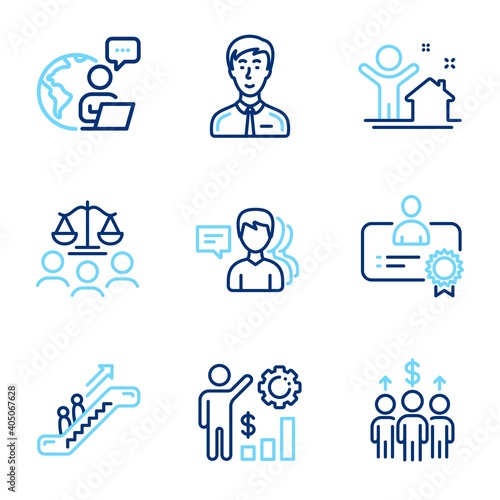 People icons set. Included icon as Meeting, People, Escalator signs. New house, Certificate, Employees wealth symbols. Court jury, Businessman person line icons. Line icons set. Vector