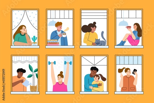 People look in open windows. Residential building facade, funny persons in apartments, cartoon neighbors look out into street, vector set