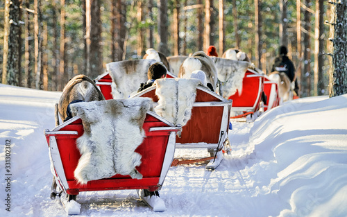 People on Reindeer sledge caravan in winter Rovaniemi forest
