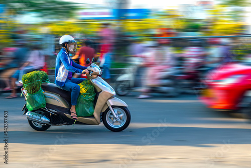 People Vietnamese driving a motorbike with holder flower or kumquat pot behind decoration purposes house for Lunar new year in Ho Chi Minh, Vietnam