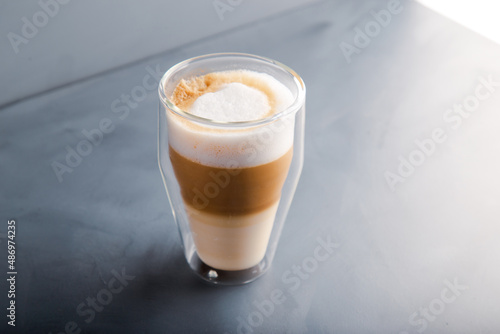 Perfectly gradient latte macchiato view over grey backdrop with copy space.