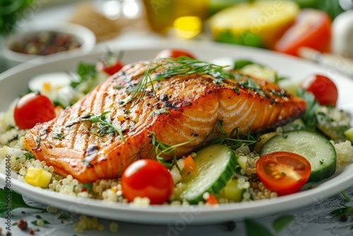 Perfectly grilled salmon fillet served on a nutritious bed of quinoa with fresh cucumbers, tomatoes, and a garnish of herbs.