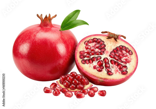 Perfectly whole red pomegranate, half-cut revealing glistening ruby-red arils with a green leaf, and sparkling loose arils, on a transparent, seamless, isolated background with no shadows, commercial