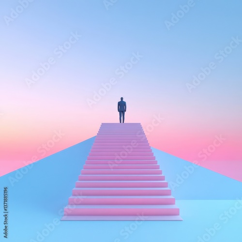 Person ascending pink stairs