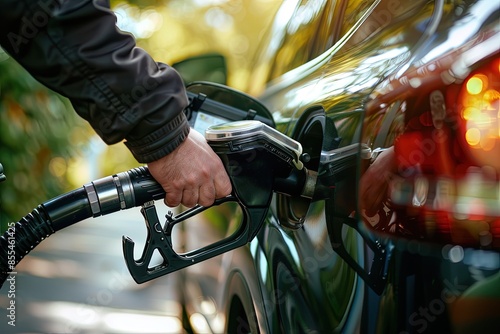 person fills up car gas at a gas station, gas pump on car fuel intake, refueling a car at a gas station. refilling the fuel at a gas station. pump fuel into a car's fuel tank in a gas station.