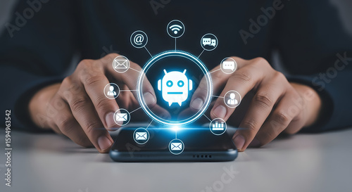 Person interacts with a smartphone displaying a digital robot and interconnected application icons, representing technological integration.