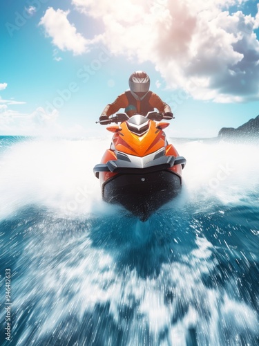 Person riding jet ski at high speed in open waters