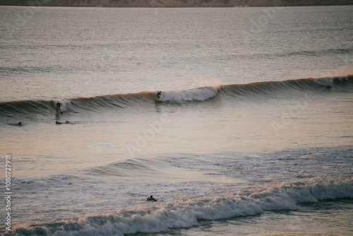 Person surfing on the waves of the sea near the coastal island and people swimming in the sea