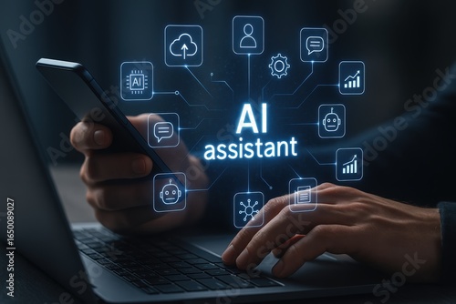 Person using a device with an overlay of artificial intelligence assistant icons.