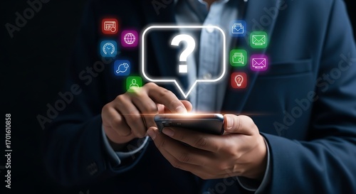 Person Using Smartphone With Question Mark And Communication Icons help support
