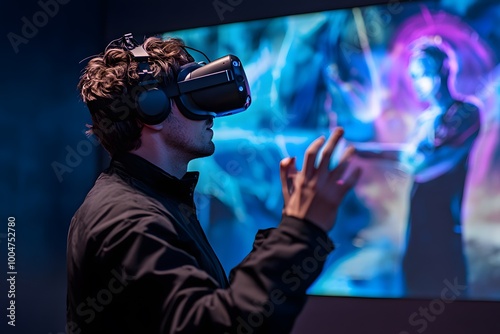person using virtual reality headset in colorful digital environment