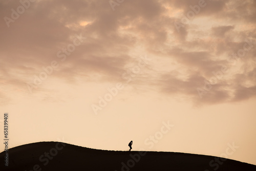 Person walking on the top of a dune during a sunset in Ica Peru