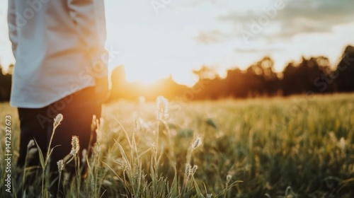 Person walking through a sunlit field at sunset, tall grass and wildflowers in focus, warm golden light. : Generative AI