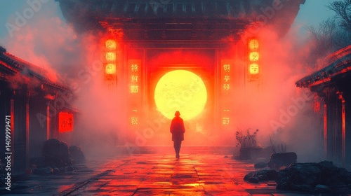 Person walking towards glowing gate in foggy ancient asian-style architecture setting.
