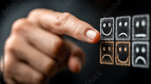 Persons finger pointing to happy face on blackboard illustrating customer satisfaction and feedback rating system showing positive emotion