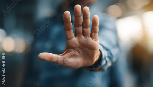 person's hand showing palm gestures stop, concept violence, warning, refuse, defense, caution. the hand sign of men a stop