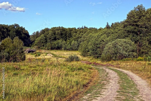 Песчаная дорога в лугу перед опушкой зелёного леса