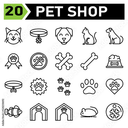 pet shop icon set include cat, pet, animal, emoticon, face, collar, dog, tag, track, pets, medal, award, paw, contest, warning, attention, alert, bone, food, chew, toys, nutrition, meal, achievement