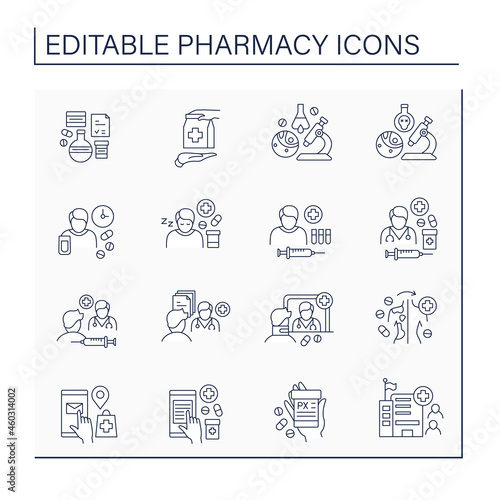 Pharmacy line icons set. Dispensing medical drugs. Research and development. Healthcare concept. Isolated vector illustrations. Editable stroke