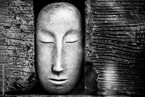 Photo artistique noir et blanc d'un visage calme et serein sculpté dans la pierre