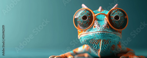 Photo of a chameleon wearing sunglasses on an isolated green background, 3D rendering in the style of cartoon with copy space concept. 3D Render of Chameleon Wearing Sunglasses on Isolated Green Bac