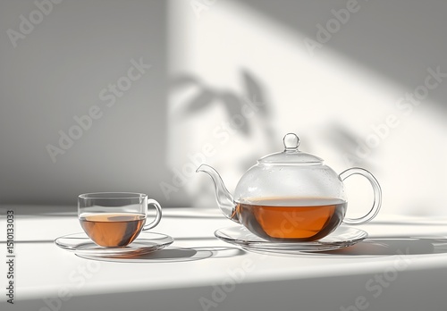 Photo of a glass teapot with dark tea next to a cup on a minimalist surface