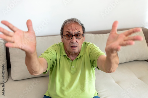 Photo of a old man arguing, shouting, angry and emotionally gesturing at home. Irritated senior man in casual clothes at home wear glasses, yelling while sitting at home isolated on bright background.