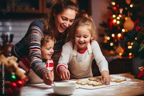 Photo of a woman and two children baking cookies together