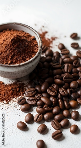Photo of closeup of roasted coffee beans and ground coffee in a bowl, isolated on white background