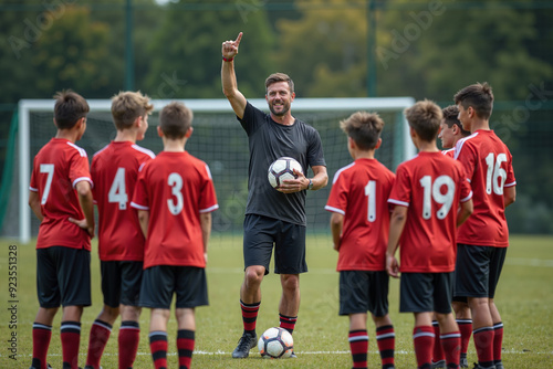 photo of coach instructor trainer teaching teenage player at soccer field, generative AI