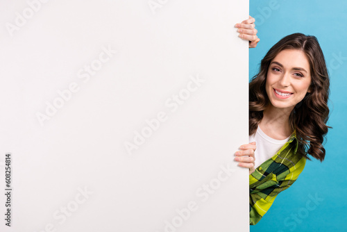 Photo of dreamy adorable woman dressed plaid shirt holding poster empty space isolated blue color background