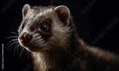 Photo of ferret, showing its playful and curious nature on black backdrop. Generative AI