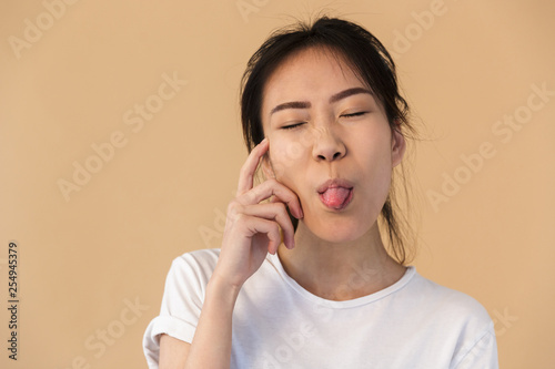Photo of joyful korean woman wearing basic t-shirt sticking out her tongue and looking at camera
