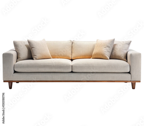 Photo of modern three seat sofa with neutral cushions isolated on transparent background