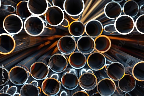 photo of Stack of stainless steel pipes background, metallurgical industry backdrop concept image