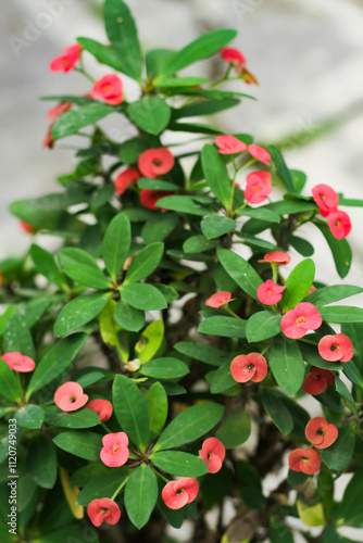 Photo of the Euphorbia milii ornamental plant which has red flowers. The plant lives in a black pot.