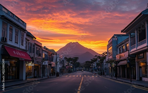 Photo of the sunrise in Lantau, Ma Wan Road with buildings and volcano silhouette in the background. Wide-angle lens, natural lighting.