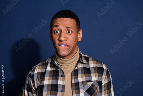Photo portrait of handsome young man bite lips nervous dressed stylish plaid garment isolated on dark blue color background