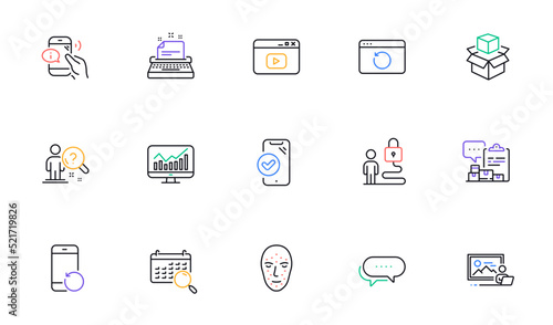 Photo studio, Packing boxes and Recovery internet line icons for website, printing. Collection of Approved phone, Statistics, Search calendar icons. Recovery phone, Lock. Vector