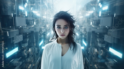 Photograph of a visionary female architect standing amidst a futuristic cityscape, her eyes filled with the possibilities of tomorrow's architecture.