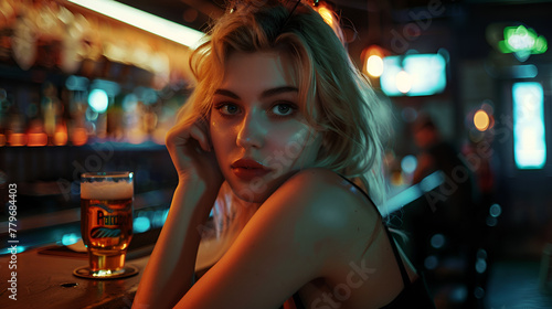 Photograph of beautiful blonde girl at a bar having a beer . Model photography