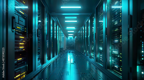 Photorealistic 3D depiction of a server room featuring node-based programming data design elements vibrant blue lighting illuminating server racks focus on high-tech data storage