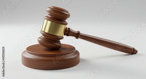 Photorealistic close-up rendering of wooden gavel with brass accents resting on base as legal symbol