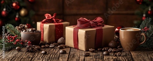 Photo-realistic holiday coffee gift setup, detailed view of coffee-related presents with seasonal decorations, high-definition clarity, natural lighting, warm tones, inviting and elegant presentation