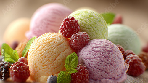 Photorealistic ice cream piled high with toppings