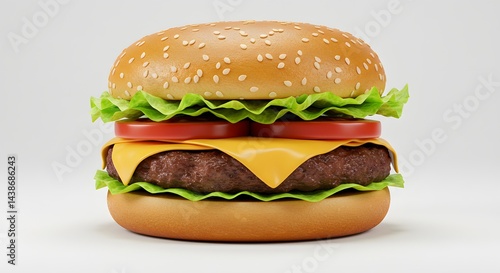Photorealistic image of a classic cheeseburger with lettuce, tomato, and sesame seed bun, centered on a white background.