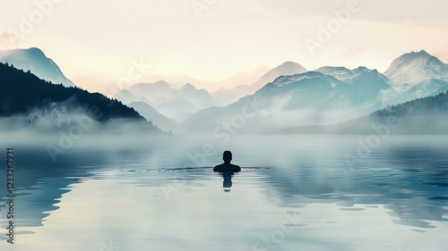 Photorealistic image of a person swimming in a serene lake surrounded by mountains and mist, feeling the quiet power of nature